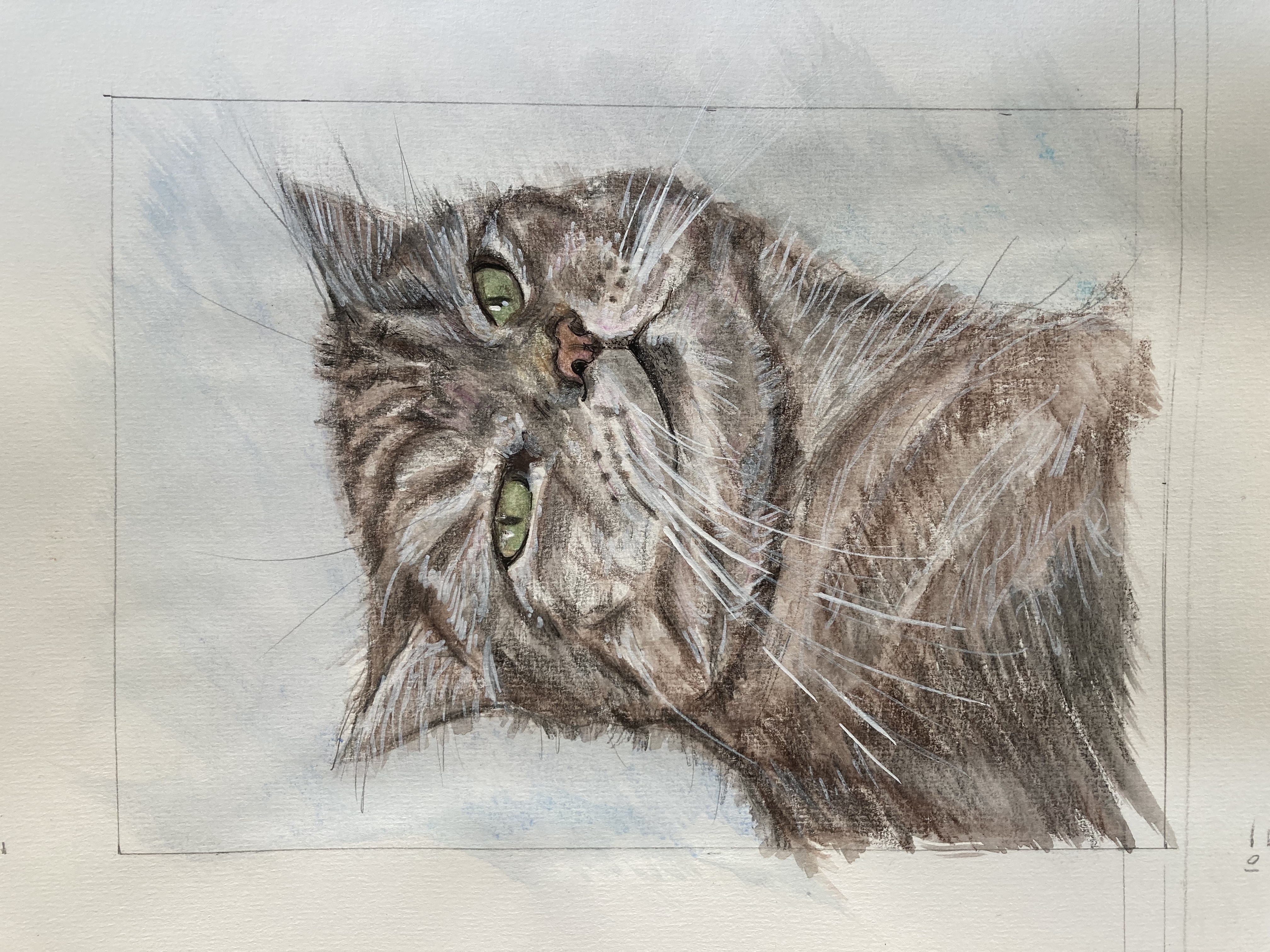 A commission of a much loved cat. Created using watercolour pencils on A5 paper.