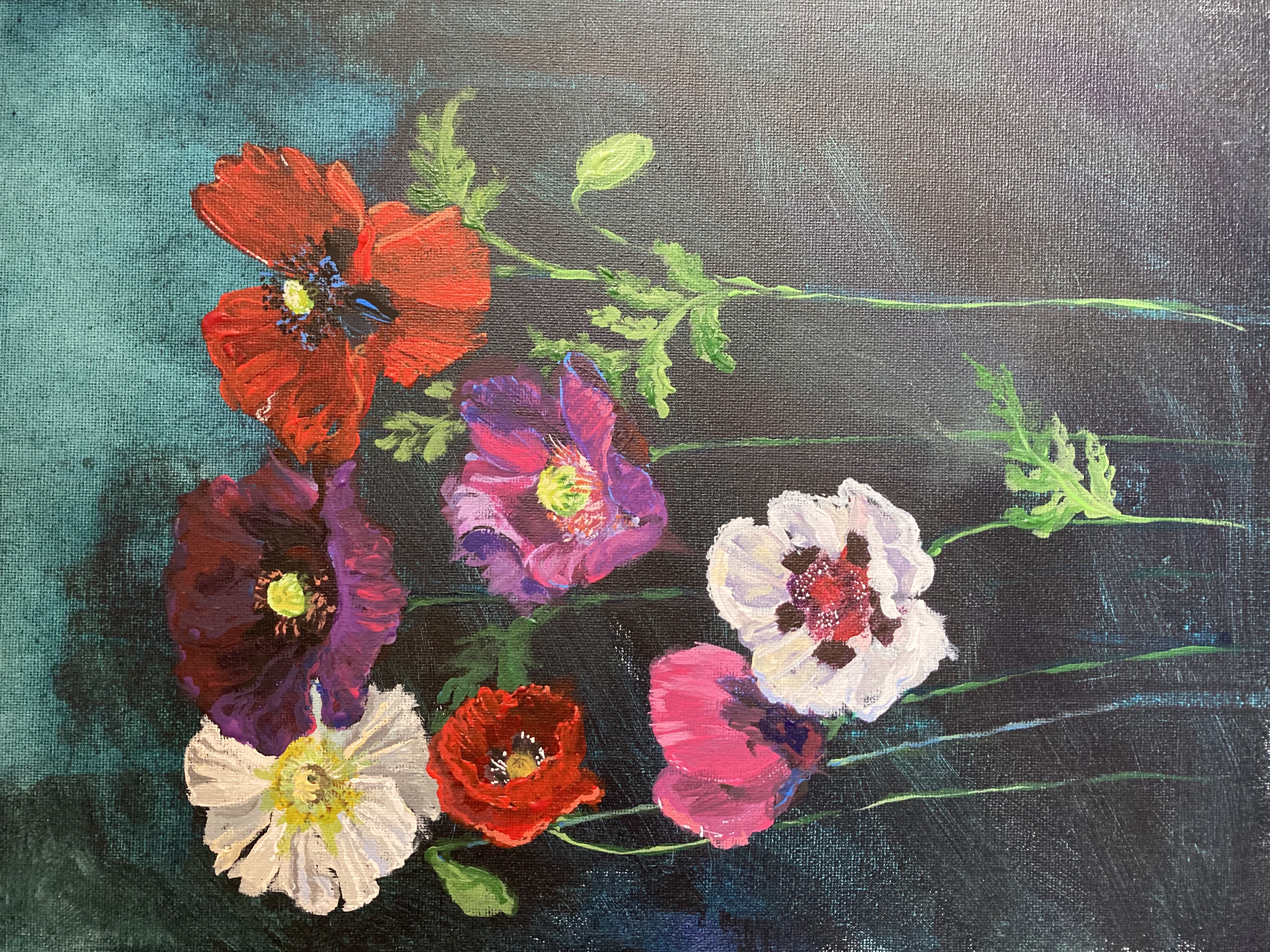 A mix of vibrant coloured poppies against a dark background. Painted in acrylic on a canvas. Set in a grey tray frame.