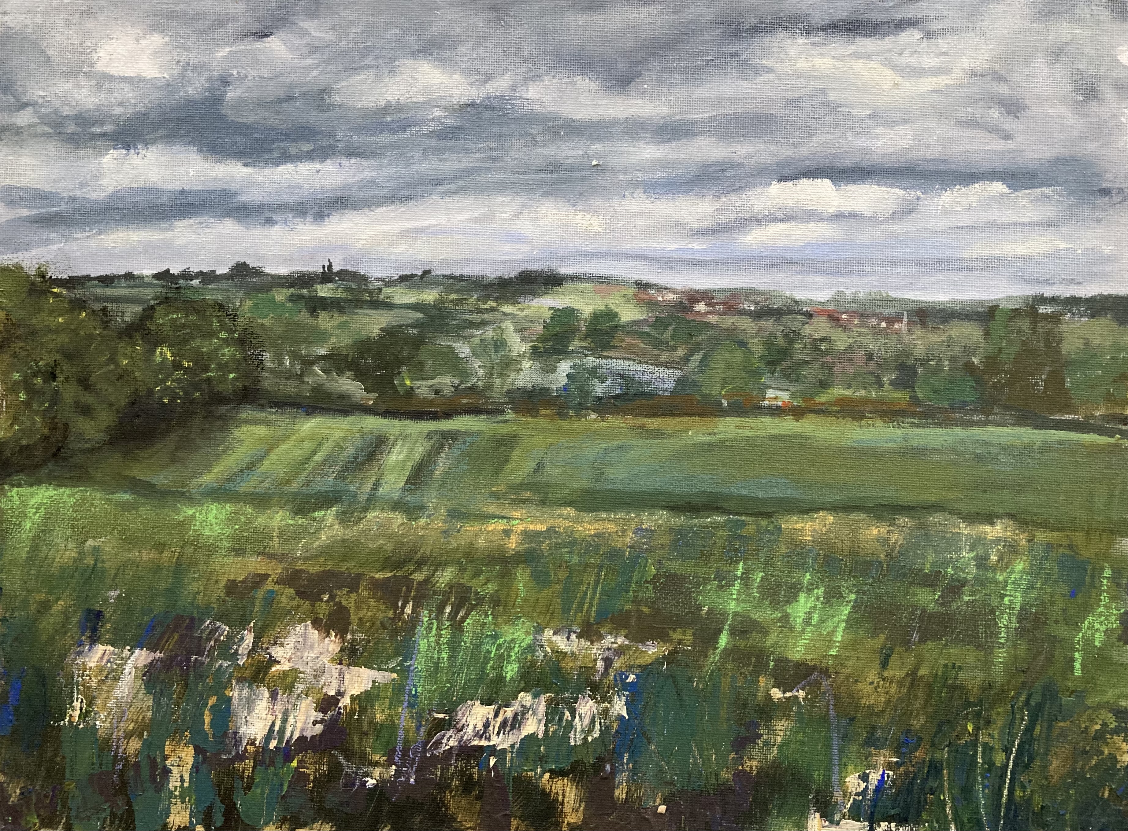 A plein air landscape, painted in one sitting. Acrylic and pastel on canvas board.