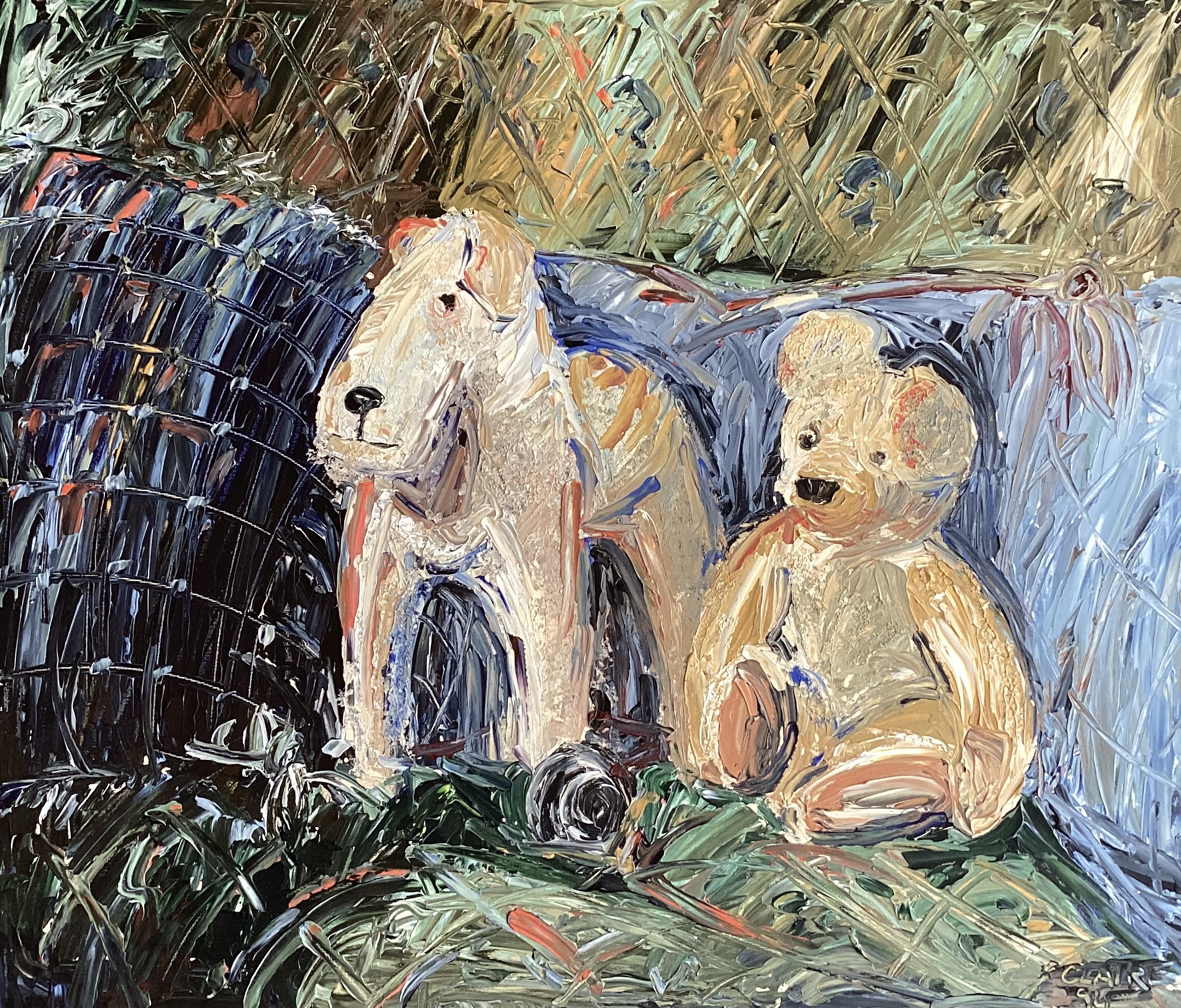 A couple of old toys in happy companionship.
