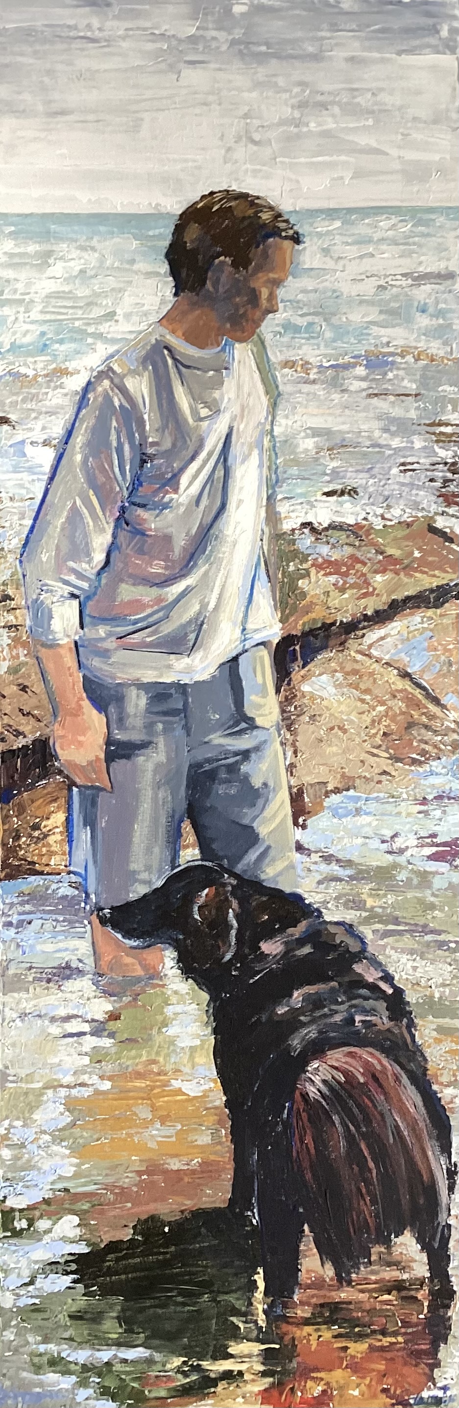 This is a very sentimental painting for me, capturing my husband and one of our dogs at the time ‘Dexter’ paddling on the Dorset coast.