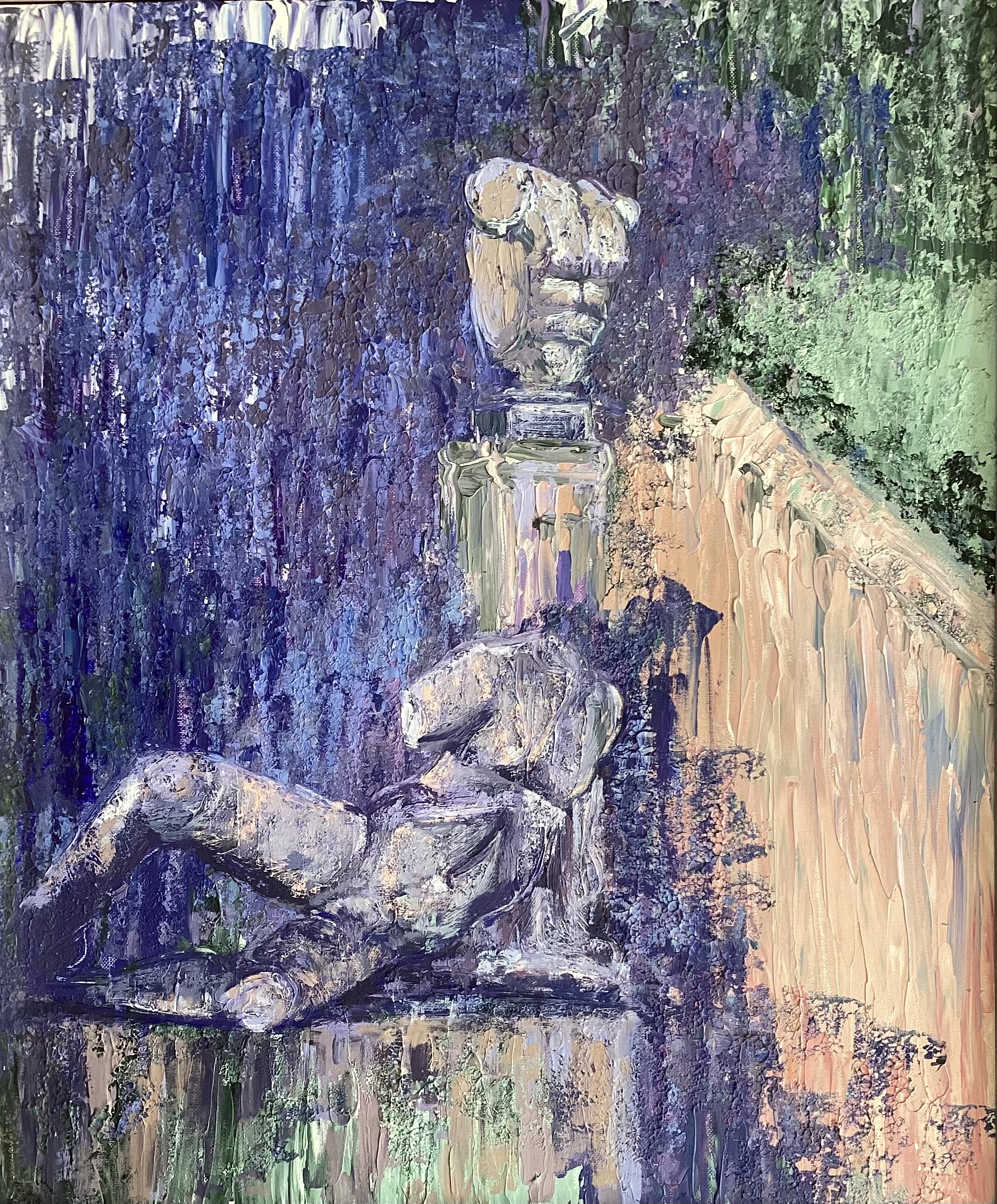 Impressionist style, statues in a garden.
