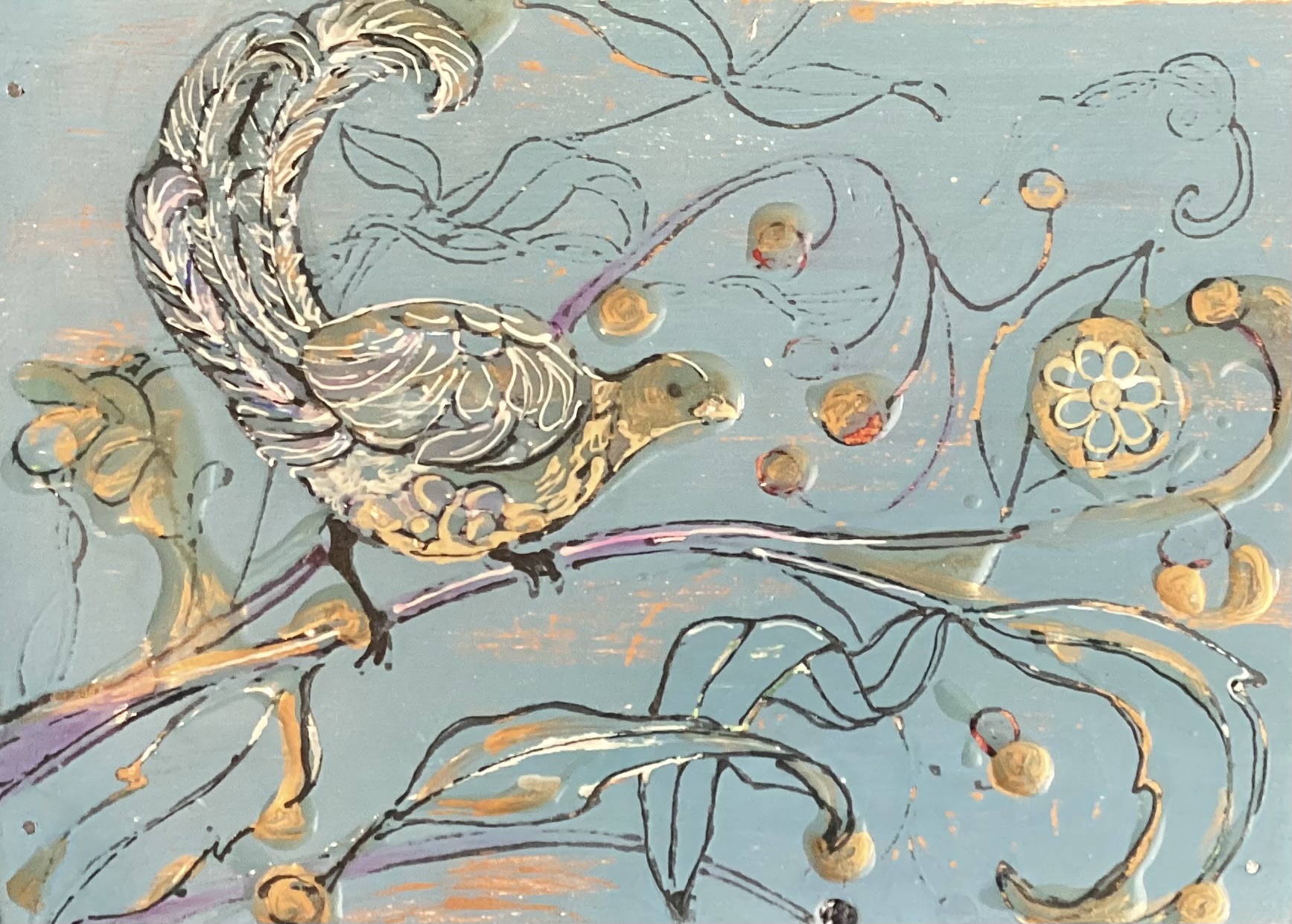 This bird is named the glass bird as once painted in acrylic on woods it was covered in a clear resin, giving it a glassy appearance.