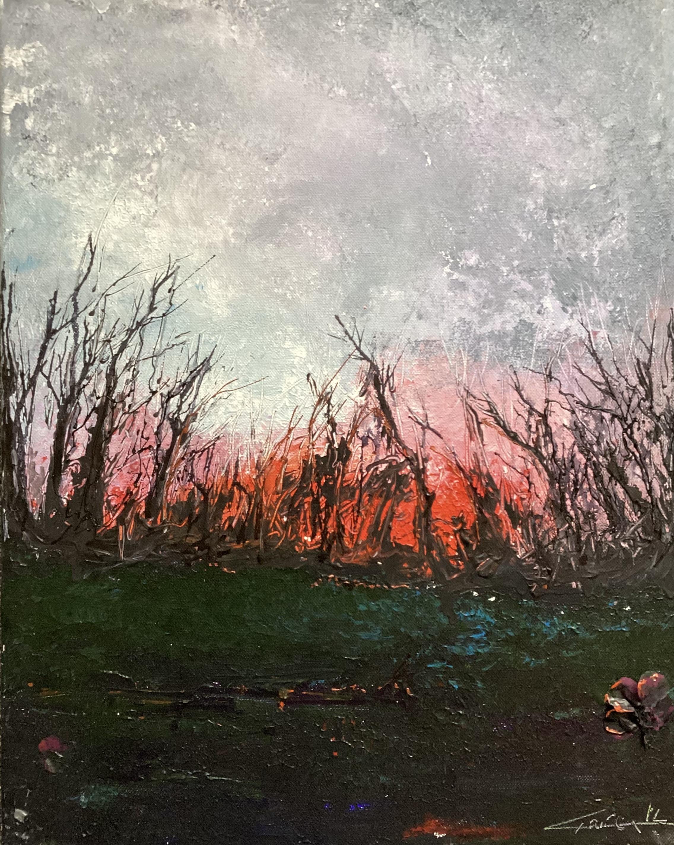 A painting in acrylic and mixed media of a brilliant sunset shining through a silhouetted hedge.