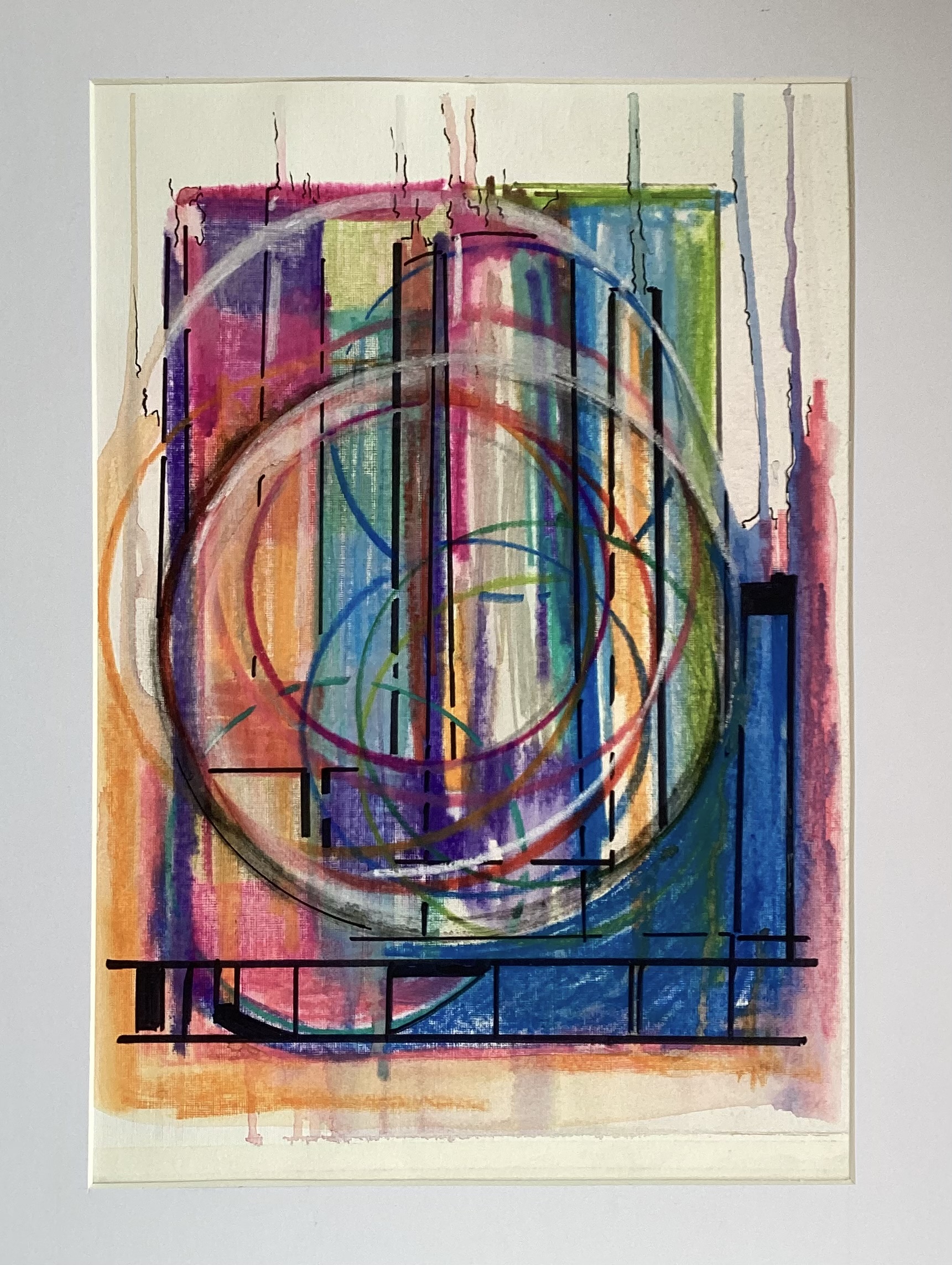 When I painted this I was experimenting with circles and bold colours. This painting has the suggestion of chimneys and dark lines, depicting an industrial setting. It is painted in mixed media on canvas paper and is presented in a white mount.