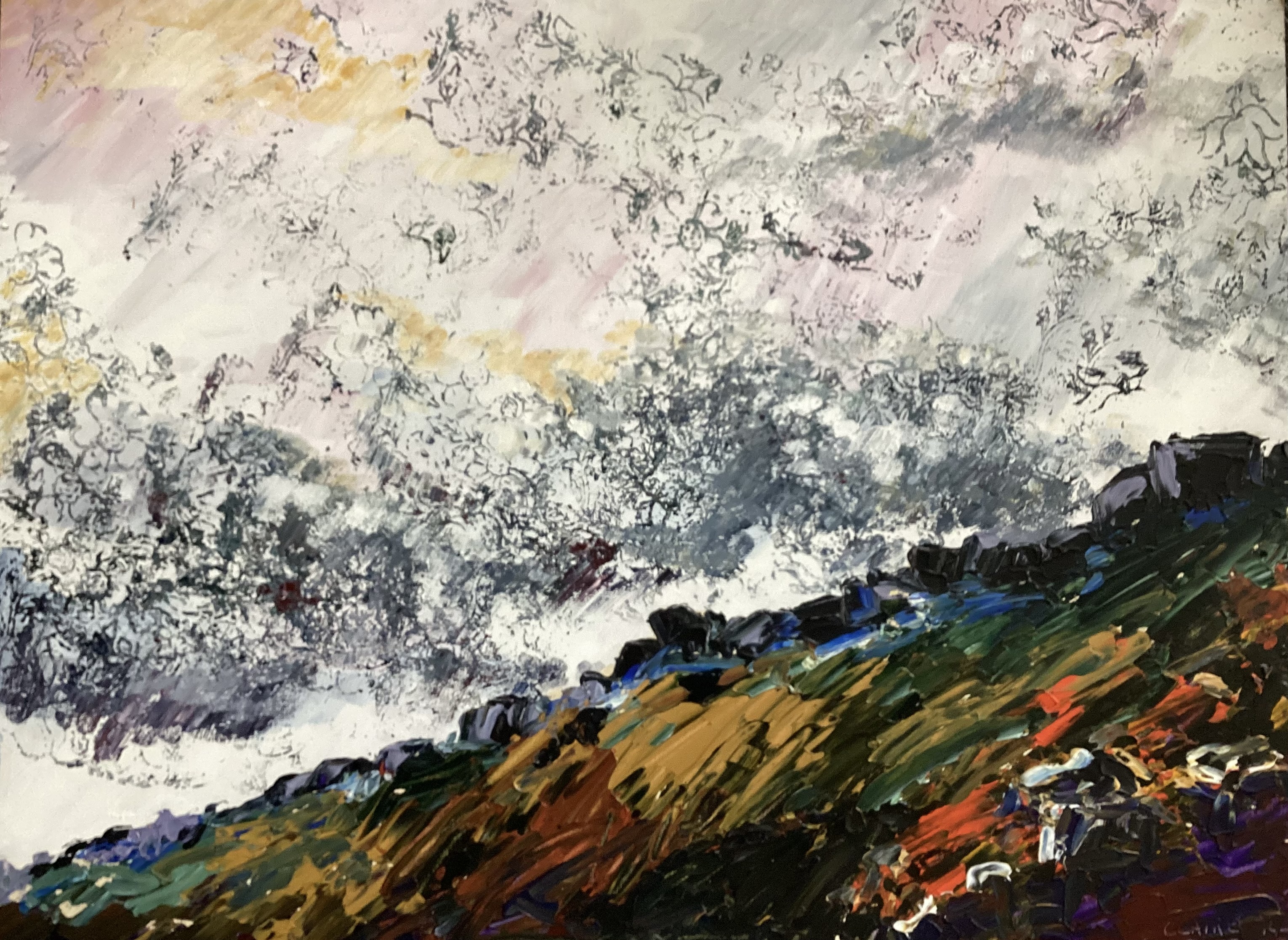 This painting captures the landscape using thick textured acrylic paint alongside a floral block print to suggest the dark clouds.