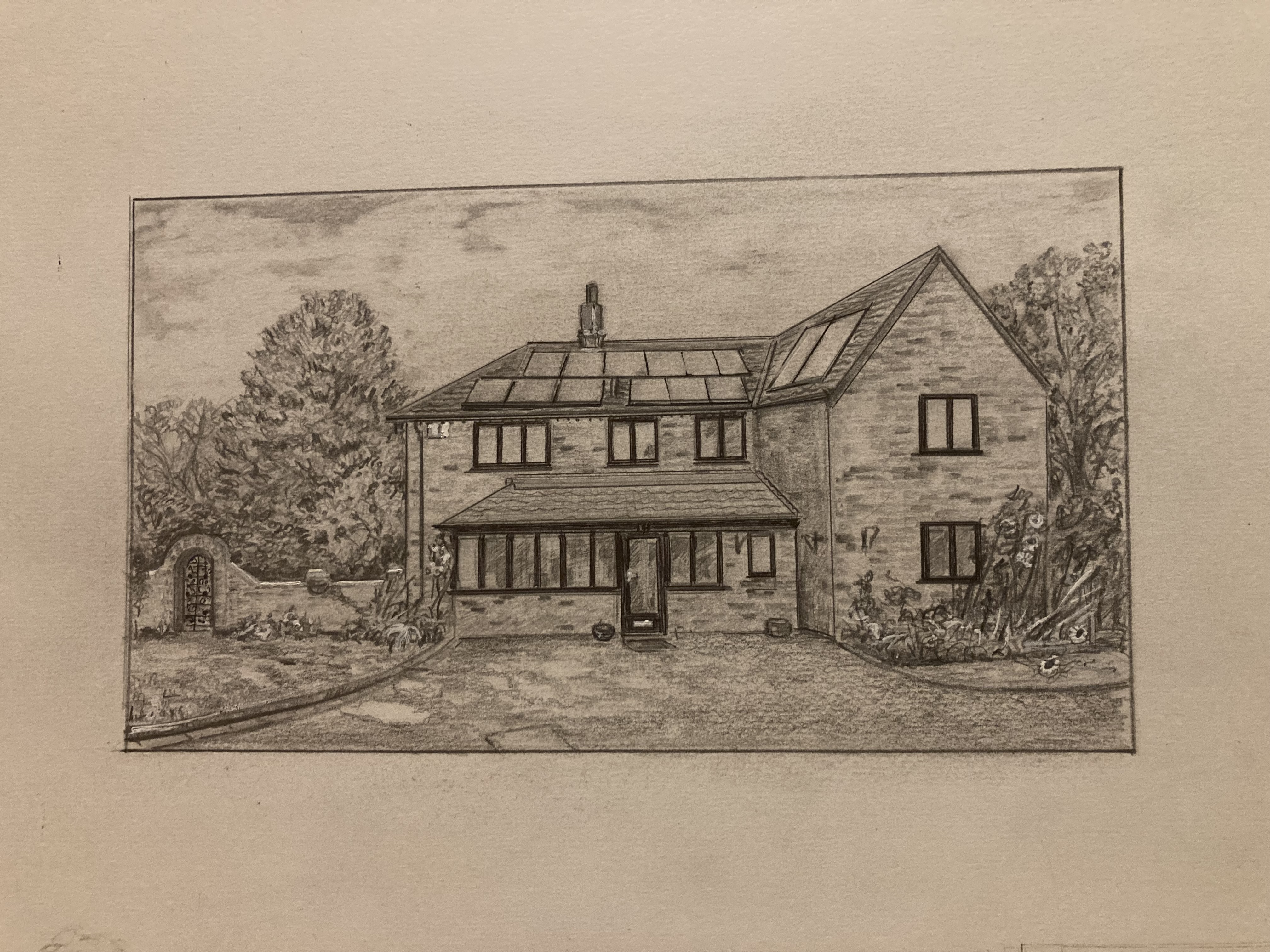 A commissioned drawing of a house in ink pen and pencil on paper.