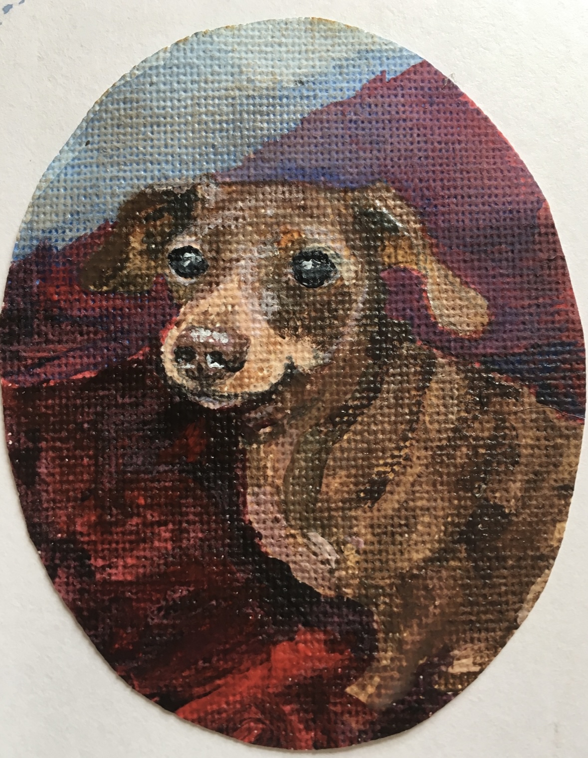 This was painted as a gift, a miniature in acrylic on canvas to fit into an oval brass frame. 6cmx4cm.