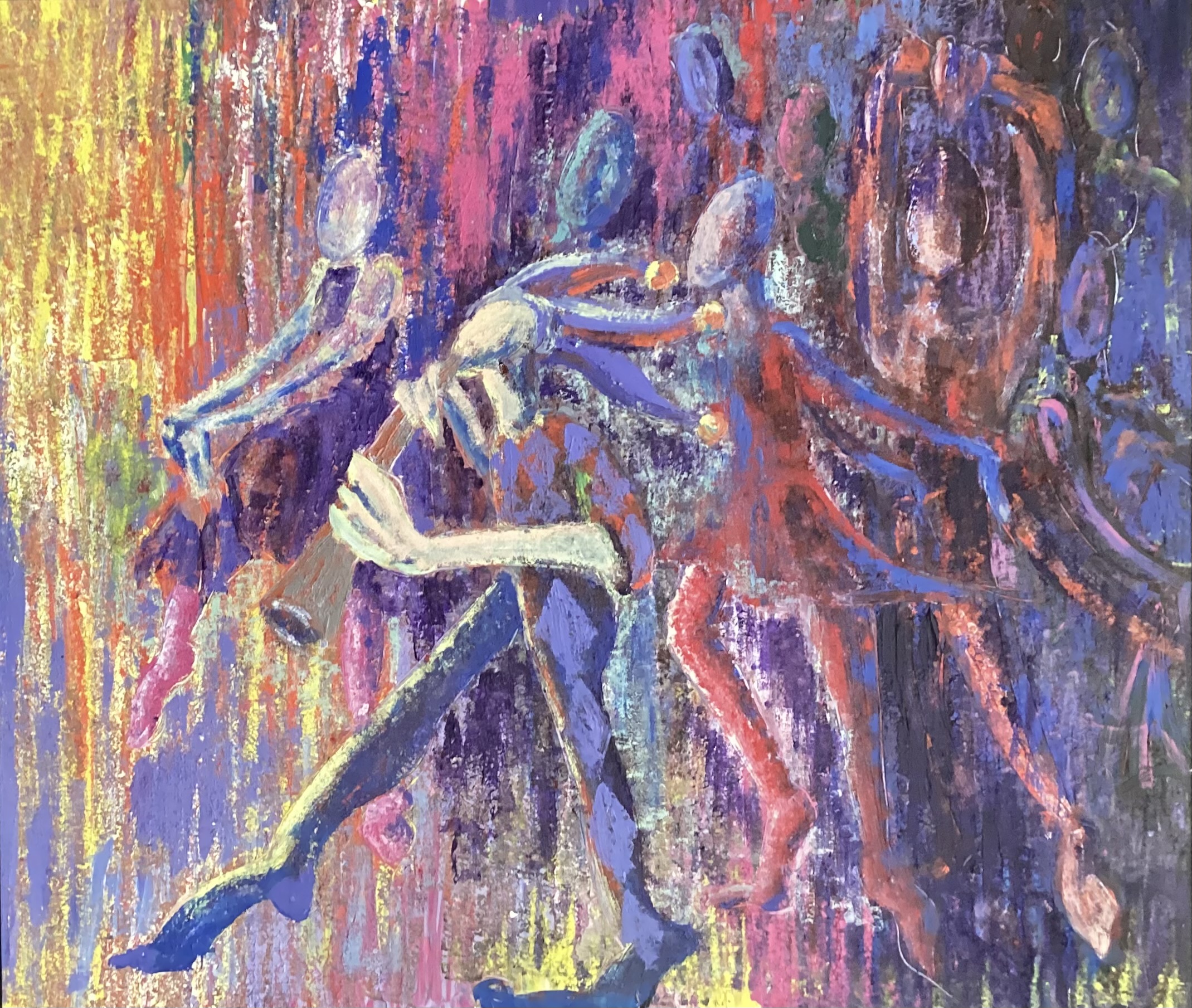 acrylic on canvas board, it is in a black frame which is slightly damaged. If you are interested in purchasing this painting I can give more information on this, message me via the contact page.