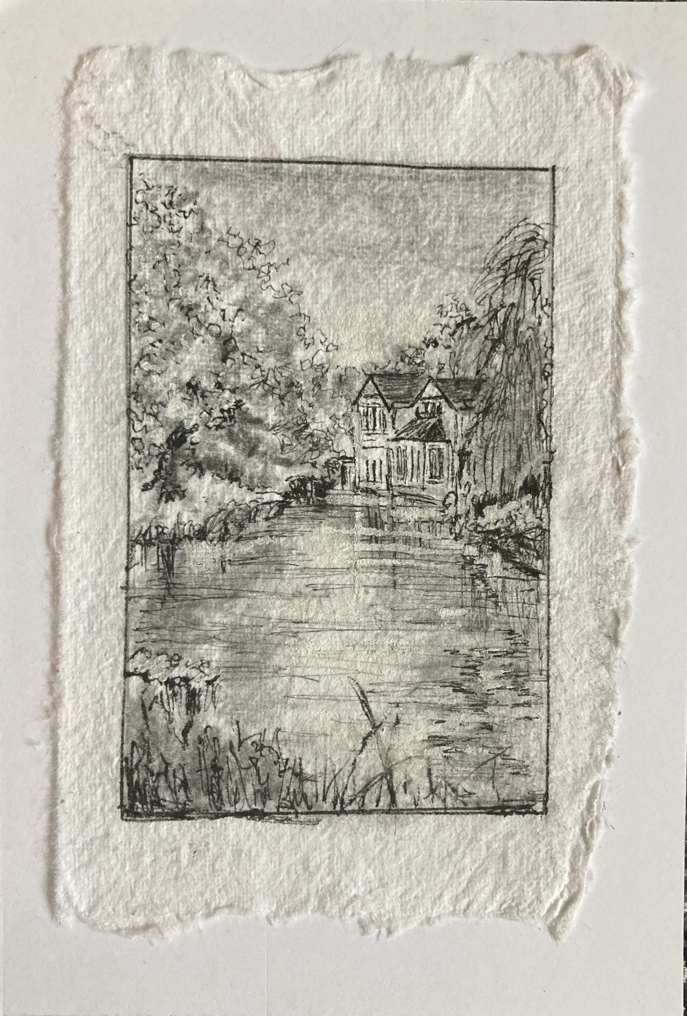 A scene of a house by the river in Denford. It is drawn in graphite, pencil and ink pen on rag paper.