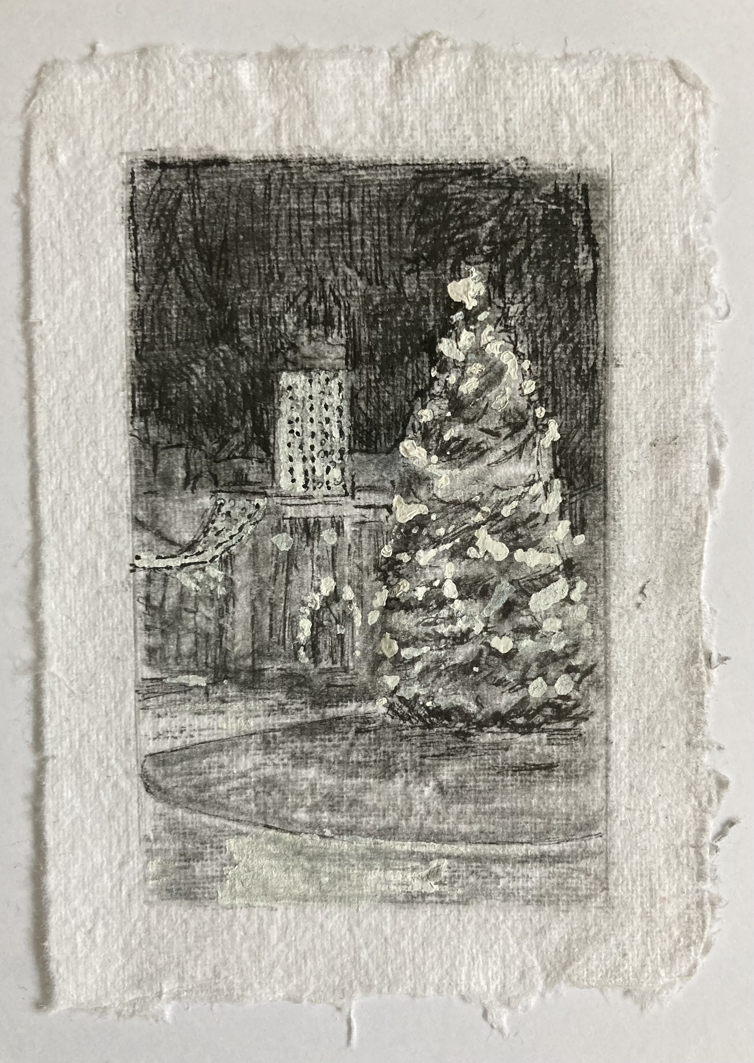 Drawing in graphite, pencil, ink pen and white pen on rag paper.