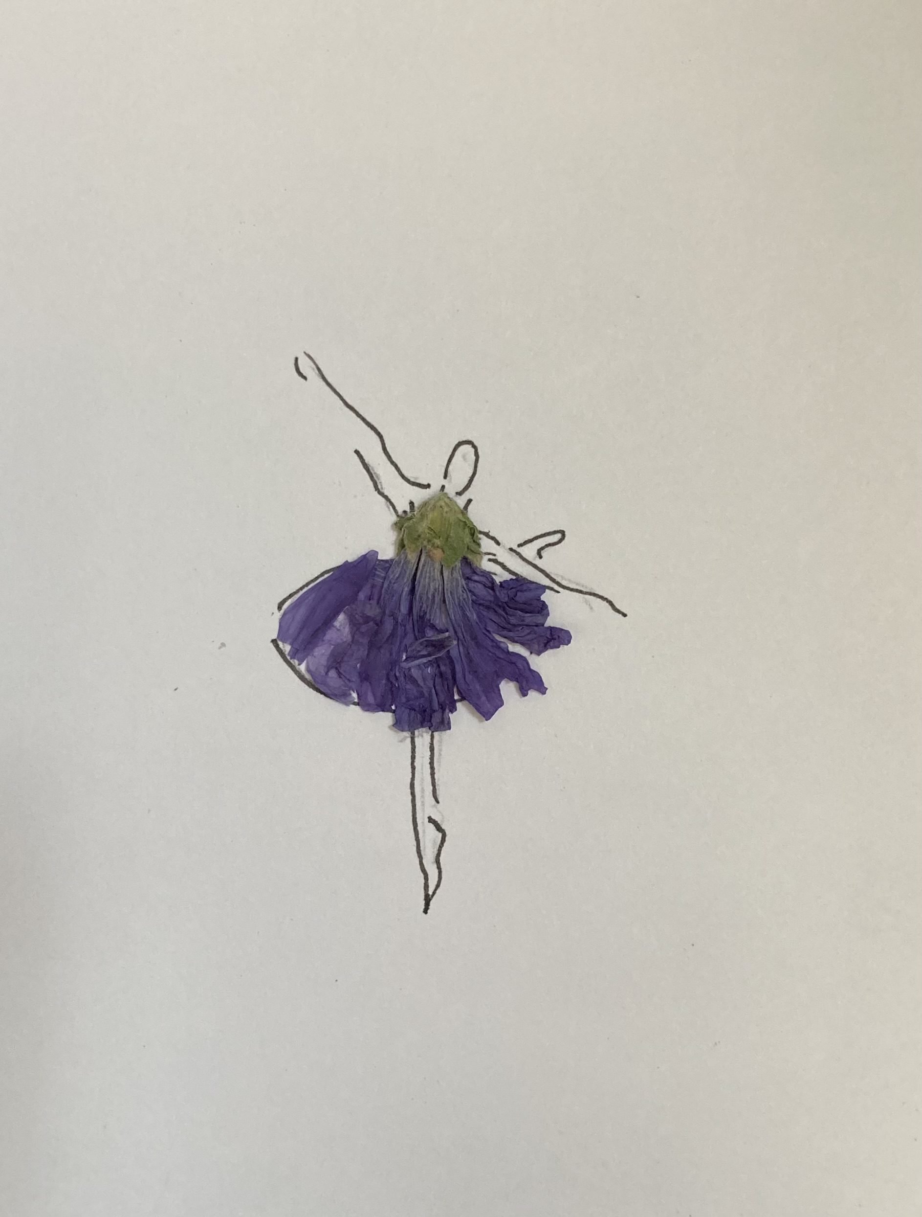 Miniature ballet dancer drawn in ink pen and clothed in dried petals.