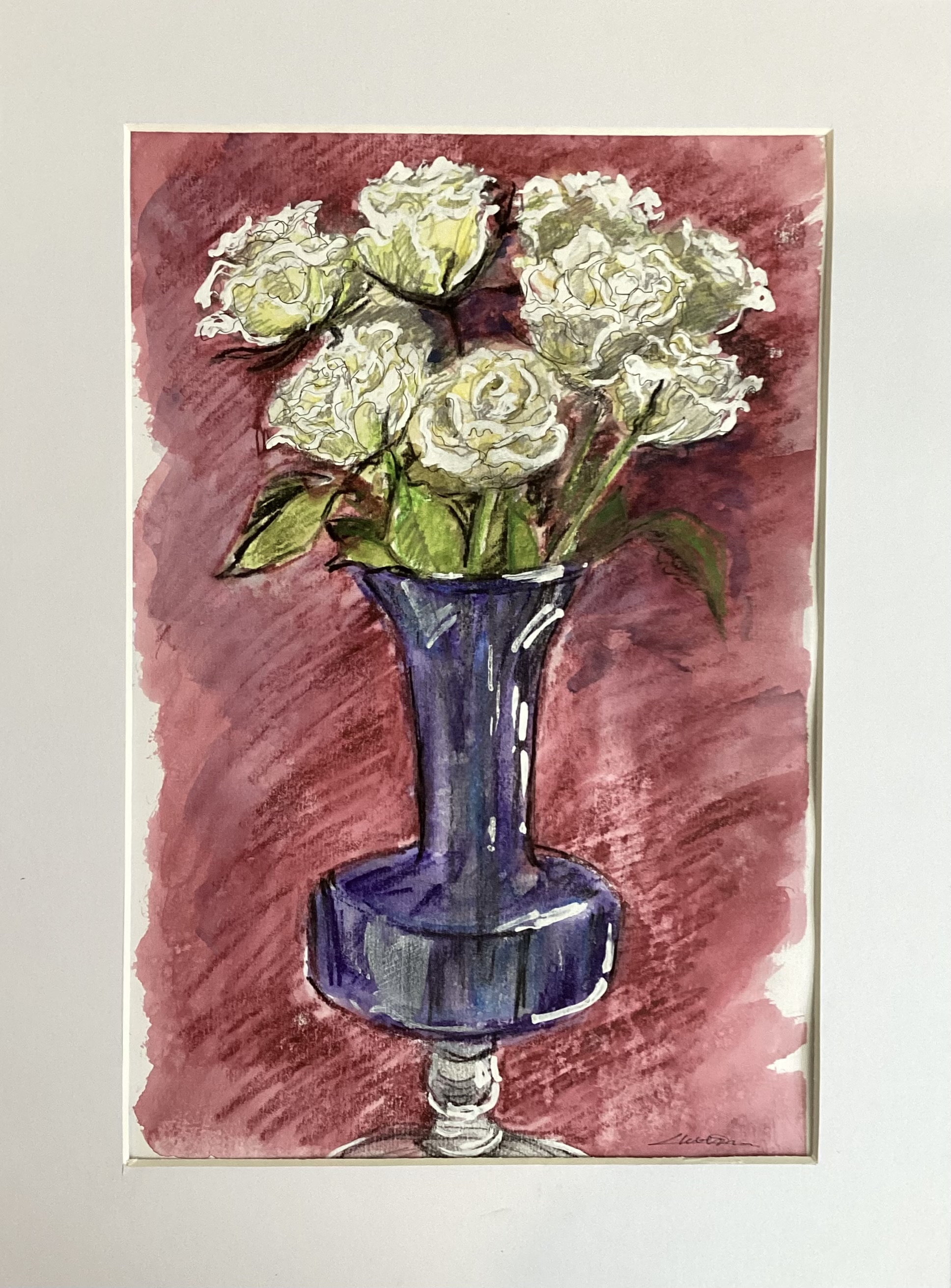 A mixed media painting on paper, presented in a white mount.
